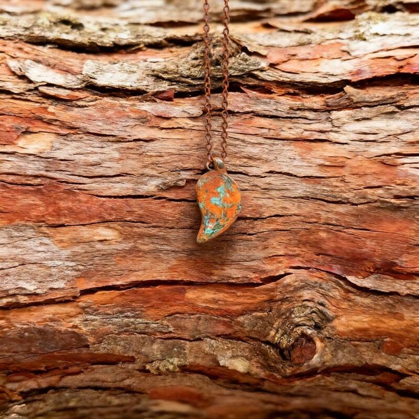 Made from 1mm Copper sheet. Acrylic coated. Chain & clasp are Bronze plated steel.